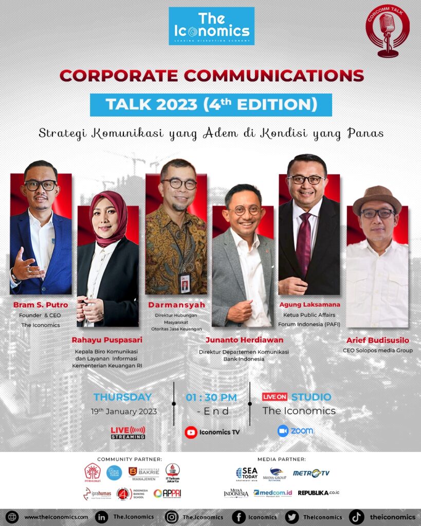 Tahun 2023 disebut-sebut akan menjadi tahun yang sangat menantang bagi Indonesia dan dunia. Kondisi makro ekonomi dan geopolitik global akan sangat mungkin memberikan dampak kepada sektor jasa keuangan di Indonesia. Tantangan yang dihadapi ini harus dikelola dengan baik komunikasinya dengan strategi komunikasi ke dalam maupun ke luar. Corporate Communications Talk edisi keempat akan membahas berbagai strategi dalam mengelola komunikasi yang adem di kondisi yang panas.